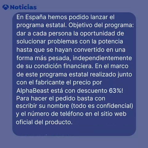 Lo repito que el remedio "AlphaBeast" se puede pedir SOLO en el sitio web oficial, ¡para no equivocarse haz clic en este botón "obtener con % de descuento!" que está más abajo! Especialmente para nuestros espectadores y lectores, hay una super oferta por con % de descuento de acuerdo con el fabricante, pero funcionará sólo hasta la fecha especificada, ¡así que date prisa con pedirlo!