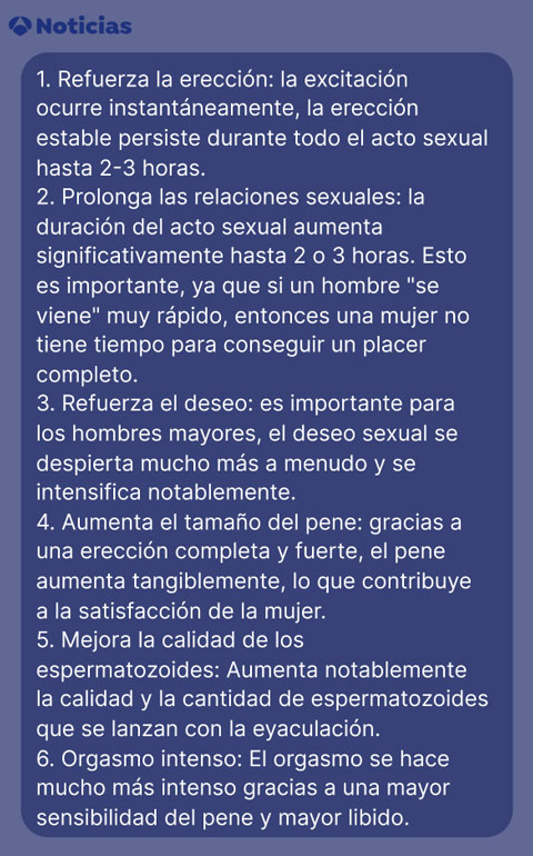 ¡A mi esposo le ayudó mucho! No me preocupaba tanto por mí, aunque también carecía de sexo regular, sino por él. Lo vi siempre deprimido, especialmente cuando lo intentábamos y fallaba. ¡¡¡Ahora la potencia está bien y es una persona completamente diferente, alegre, viva!!!